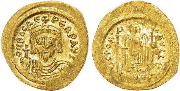 DN FOCAS PERP AVG, crowned bust facing, holding cross. Rev. VICTORIA AVCC I, angel standing facing, holding globus cruciger and rho-topped cross, CONOB in exergue. (Sear 618). Extremely Fine.
