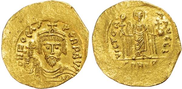 DN FOCAS PERP AVG, crowned bust facing, holding cross. Rev. VICTORIA AVCC E, angel standing facing, holding globus cruciger and rho-topped cross, CONOB in exergue. (Sear 620; MIB 9). Extremely Fine. Lustrous.