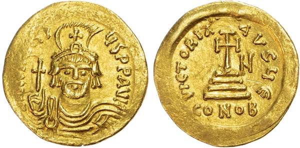 dN hЄRACLI-ЧS PP AVG, crowned, draped and cuirassed bust facing. Rev. VICTORIA-AVϚЧ Є, cross potent set on three steps, CONOB in exergue. (Sear 732). About Extremely Fine. A couple of marks.