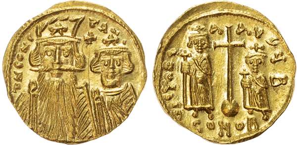 Constans II, with Constantine IV, Heraclius and Tiberius (AD 641-668) AV Solidus, Constantinople, c. AD 659-661, 4.45g.