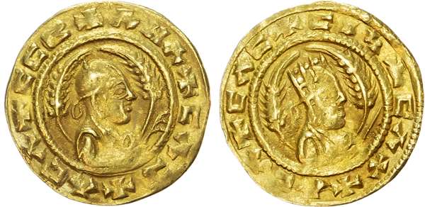 Crowned and draped bust facing right, holding a stick, flanked by two stalks of wheat. Rev. Draped bust facing right, wearing a headcloth, flanked by two stalks of wheat. (H&K 43; SACAM 274). Good Very Fine.