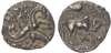 Head, neck and forelegs of three horses arranged in a spiral formation, pellets around. Rev. Bull right, bird on back, pellet-in-annulet above and pellets around. (ABC 327; BMC -). Good Very Fine. Pleasing collection tone. Excessively Rare.