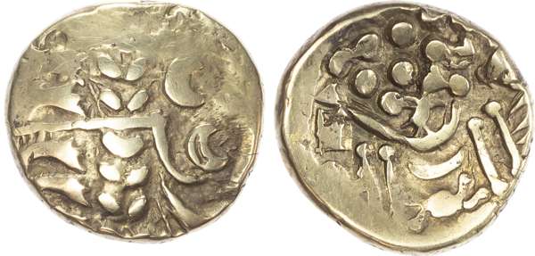 Abstract head of Apollo right. Rev: Stylised horse left, ‘crab’ motif below, pellets around, zig-zag pattern between two lines below. (ABC 746; VA 1205-1). Good Very Fine.