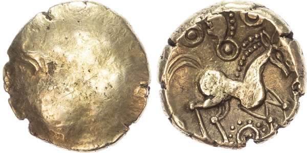 Blank mound, traces of ‘crossed wreaths’ type. Rev. Stylised horse right, pellets-in-annulets above, beaded pellet-in-annulet below. (ABC 1408; VA -; MfT Snettisham, die group 1, dies A/1). Good Very Fine. Extremely Rare.