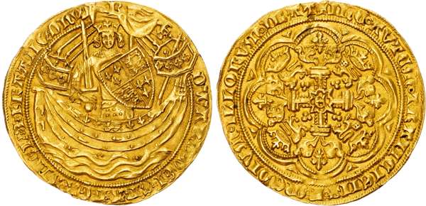 London mint, mintmark cross 3. Crowned king facing in ship holding upright sword and quartered shield, beaded circle surrounding legend reads EDWΛRD x DEI x GRΛ x REX x ΛNGL ‘x Z x FRAANC x DhYB, single saltire stops. Rev, large closed Lombardic E in centre of a floriated cross with lis terminals, lions and crowns in angles all within a tressure of eight arcs, fleurs in spandrels, legend reads + IhE o AVTEM o TRANCIENS o P o MEDIVM o ILLORVM o IBA, single annulet stops, 7.72gm (S. 1489/1490; N. 1173/1183; Schneider 37). Nearly Extremely Fine, full weight on a good round flan.