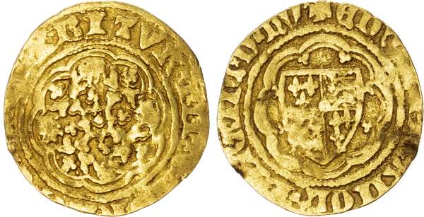 Shield inside double tressure of eight arcs, trefoils on cusps, legend surrounds + EDWAR R ANGL 'x I x FRANC x D x hY. Rev, floriate cross, leopards in angles, trefoils on cusps, + EXALTABITVR x IN x GLORIA, 1.68gm (S. 1498; N. 1191). Fine, clipped, ex. mount.