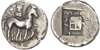 Warrior, helmeted, holding two spears, standing behind horse, right. Rev. MO-S-SE-W, around a square, all within a incuse square. (Tr. pl. 46, 18). Good Very Fine. Rare.
