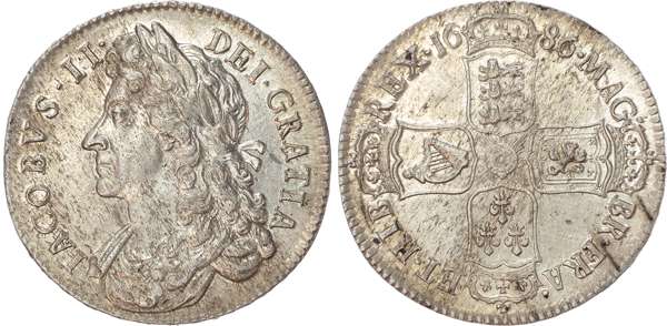 James II (1685-1688), Halfcrown, 1686 SECVNDO, first laureate and draped bust left, rev. crowned shields cruciform, seven strings to harp, lettered edge, (Bull 749; ESC 494; S.3408). Near extremely fine, underlying mint brilliance. Some flecking on both sides.