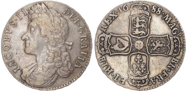 James II (1685-1688), Halfcrown, 1688 QVARTO, second laureate and draped bust left, rev. crowned shields cruciform, nine strings to harp, (Bull 759; ESC 502; S.3409). Good fine.