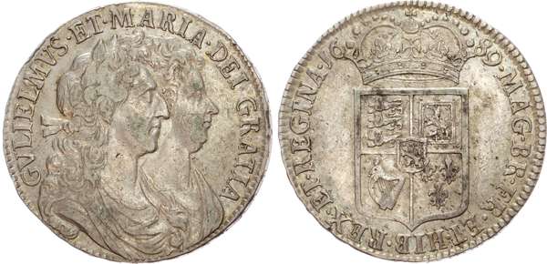 William and Mary (1688-1694), Halfcrown, 1689 PRIMO, conjoined and draped busts right, rev. first shield, caul only frosted, with pearls, (Bull 834; ESC 506; S.3434). Very fine, toned.