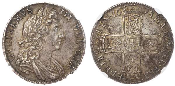 William III, (1694-1702), Halfcrown, 1698 DECIMO, first laureate, draped and cuirassed bust right, rev. crowned shields cruciform, large square shields, ordinary harp with seven strings, (Bull 1034; ESC 554; S.3494). Encapsulated by NGC as AU58.