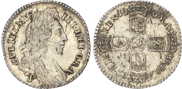 William III (1694-1702), Sixpence, 1696, York, first bust right, Y below, rev. three strings to early harp, large crowns, mixed sized lettering to reverse, obliquely milled edge, 7h, 2.86g (ESC 1539; Bull 1296; S.3525). Very fine, lightly toned.
