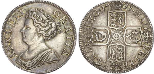 Anne (1702-1714), Shilling, 1711, fourth draped bust left, rev. crowned shields cruciform, six strings to harp, (ESC 1158; Bull 1408; S.3618). Bold good very fine, toned.