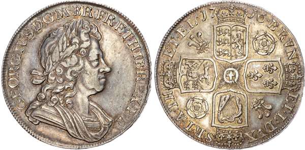 George I (1714-27), Crown, 1716, laureate and draped bust right, toothed borders surrounding, reads GEORGIVS DG M BR FR ET HIB REX FD. Rev, crowned cruciform shields, eleven strings to Irish harp, garter star, roses and plumes in angles, date flanking top crown, reads BRVN ET L DVX S.R.I.A:TH ET. EL, edge inscription as DECUS ET TUTAMEN ANNO REGNI SECVNDO (S.3639; Bull.1540; ESC 110). Bold good very fine to near extremely fine, toned with underlying mint brilliance.