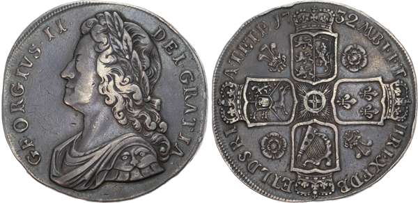 George II (1727-1760), Crown, 1732 SEXTO, laureate, draped and cuirassed bust left, rev. crowned shields cruciform, roses and plumes in angles, ten strings to harp, (Bull 1660; ESC 117; S.3686). Bold very fine to good very fine, toned.