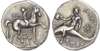 Youth seated right on horseback, crowning the horse, ΞΩ / NEY / MH. Rev. ΠΟΛΥ, Taras, holding helmet, riding dolphin left, TAPAΣ below. (Vlasto 739-45; HN Italy 1006; SNG ANS 1106-12). Good Very Fine. Attractive iridescent cabinet tone.