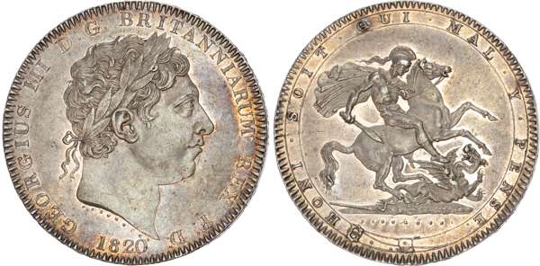 George III (1760-1820), Crown, 1820 LX, laureate bust right, rev. St George and Dragon within Garter, ( S.3787; Bull 2016; ESC 219). Good extremely fine, attractively toned with underlying mint brilliance.