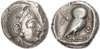 Archaic head of Athena facing right, wearing crested helmet. Rev. AOE, owl standing right, olive sprig behind. (Seltman group G; Asyut group IV). Good Very Fine. Scarce archaic type.