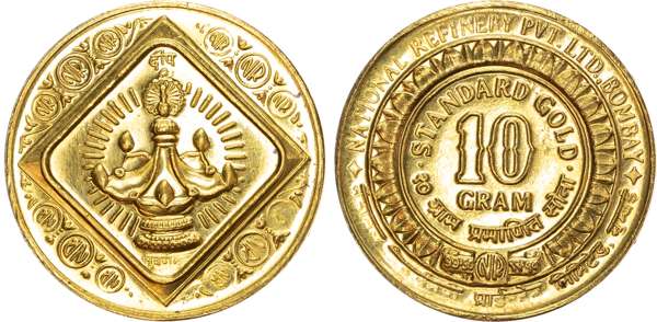 India, National Refinery Pvt. Ltd, Bombay, Standard Fine Gold, gold 10 Grams, undated (c. 1950), purity 0.995, 10g (KM unlisted). Uncirculated. Lustrous.