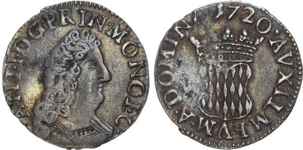 Monaco, Antoine I (1701-1731), billion ½ Pezzetta / 1 ½ Sols, 1720, 2.10g (KM 78; G. 88). Good Very Fine. Extremely rare coin of an early Monegasque ruler. The Half Pezzetta seldom comes to the market, especially in nice condition. Antoine I completed the fortifications of the Rock of Monaco, constructed L’Oreillon and the Fort Antoine.
