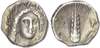 Head of Demeter facing slightly to the right, wearing a wreath of grain ears. Rev. META, vertical ear of barley, bucranium to right, APA below leaf. (HN Italy 1584; SNG ANS 463-4). Very Fine.