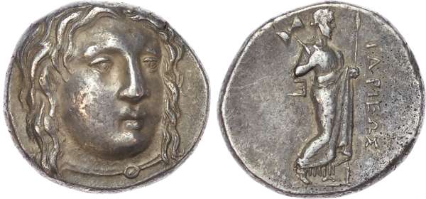 Head of Apollo facing. Rev. ΙΔΡΙΕΩΣ, Zeus Labraundos standing right, holding lotus-tipped sceptre and double-axe. (MFA 2000; McClean 8521). Good Very Fine.
