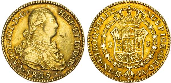 Spain, Charles IV (1788-1808), gold 2 Escudos, 1805 FA, Madrid, 6.77g (A&C 1312). Good Very Fine.