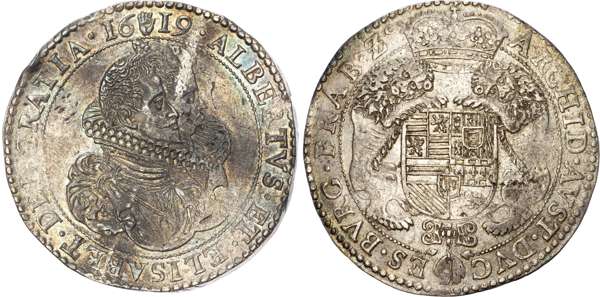 Spanish Netherlands, Brabant, Albert and Elizabeth (1598-1621), silver Ducaton, 1619, Anvers, 32.57g (Dav. 4428; Delm. 249). Good Very Fine.