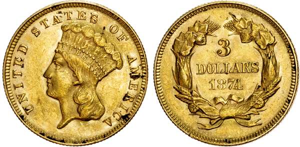 USA, Indian Princess Head, gold 3 Dollars, 1874, Philadelphia