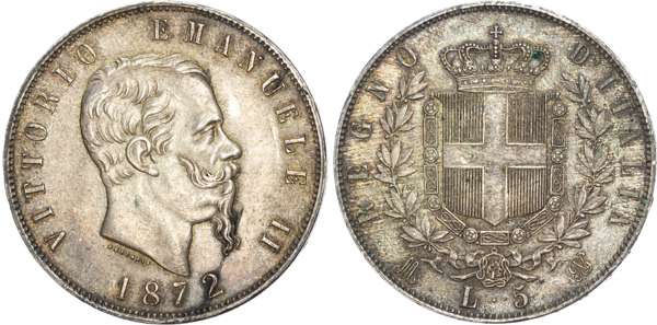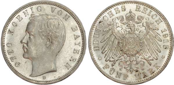 World, silver Crowns (5), including: Germany, Bayern, Otto (1886-1913), silver 5 Marks (1), 1913 D, Munich, 27.80g (Dav. 618); Netherlands, Willem III (1849-1890), silver 2 ½ Guldens (1), 1871, 24.97g (Sch. 597); Italy, Kingdom, silver 5 Lire (2), 1872, Milan, 25.05g (KM 8) and 1879, Rome, 25.04g (KM 20); Spain, Isabella II (1833-1868), silver 20 Reales, 1852, 26.08g (KM 593.3). Fine to Very Fine, Germany, Spain and Netherlands cleaned, Italian coins residue to surfaces. Sold as seen, no returns. (5)