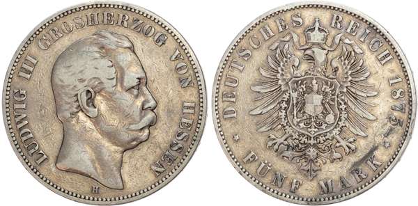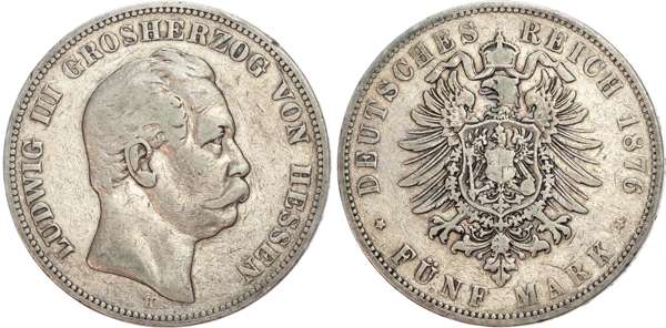 Germany, Hesse-Darmstadt, Ludwig III (1848-1877), silver 5 Marks (2).