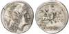 Helmeted head of Roma right, V (mark of value) behind. Rev. The Dioscuri on horseback right, each holding sspear, two stars above. (Crawford 44/6; Sydenham 169). Extremely Fine.