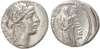 SALVTIS, laureate head of Salus facing right, wearing pendant earring and necklace of pearls. Rev. MN·ACILIVS-III·VIR·VALETV, Valetudo standing left, leaning on column and holding a serpent. (Crawford 422/1b; Sydenham 922). Good Fine. Somewhat off-centre.