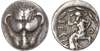 Lion’s scalp facing. Rev. Iokastos seated left, holding long staff, all within a wreath. (HN Italy 2478). Good Very Fine.