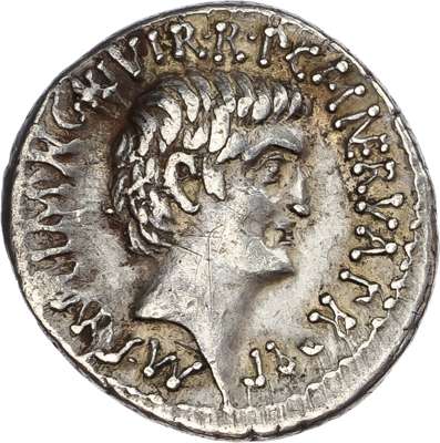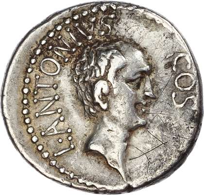 M•ANT•IMP•AVG•III•VIR•R•P•C•M•NERVA•PRO•Q•P, bare head of Mark Antony facing right. Rev. L•ANTONIVS COS, bare head of Lucius Antony facing right. (Crawford 517/5a; Sydenham 1185). Good Very Fine. Graffito to reverse.