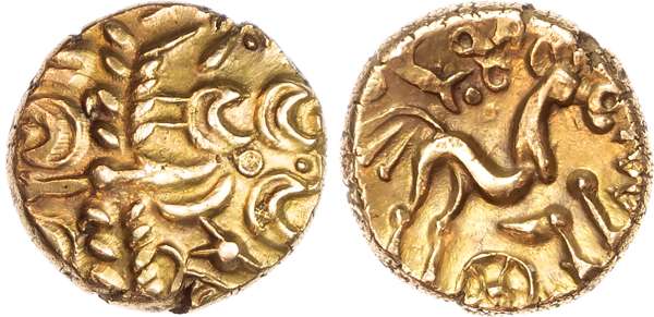 Atrebates & Regini, Commius (c. 50-25 BC) AV Stater, ‘Muzzles’ type, 5.64g. Stylised, devolved head of Apollo facing right. Rev. [COMMIOS], stylised horse right, arm and three ‘horse muzzles’ above, wheel below. (ABC 1022; VA 350-1; BMC 724-9). Extremely Fine. Rare. A very attractive piece.