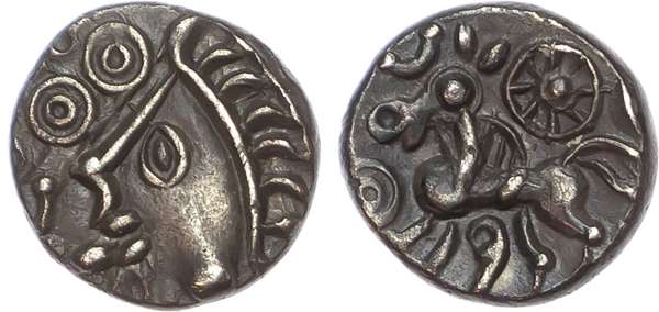 Stylised ‘moon head’ left, two sets of concentric rings to left. Rev. Horse left, wheel above, symbol below. (ABC 1034; VA 355; BMC 355). Extremely Fine. Rare. Pleasing cabinet tone.