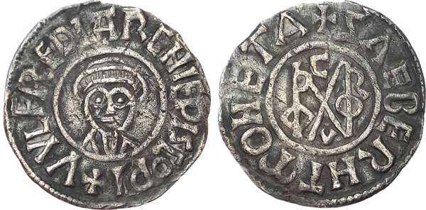 Archbishops of Canterbury, Wulfred (805‑32), AR Penny, Canterbury, Sæberht. Tonsured bust facing, no pellets in fields, +VVLFREDI ARCHIEPISCOP, rev. D orobernia C ivitas m onogram, +SAEBERHT M ONETA a round, 1.21gm. ( N.aismith C46.1; S CBI F itzwilliam 4 38; N240; S 888). Very Fine and toned, minor surface marks. Rare.