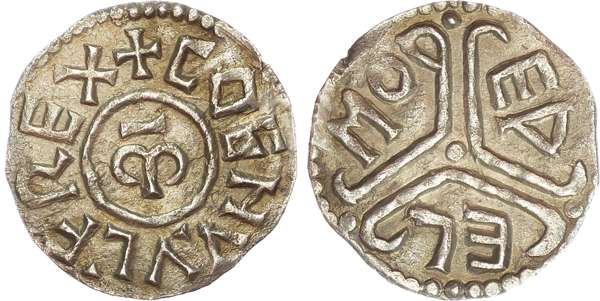 Kings of Mercia, Coenwulf (796-821), Penny, Canterbury, Æthelmoth, (Struck circa 796-805). M in central circle, COENVVLF REX around, rev. In angles of double line tribrach moline- EDELMOD (second D incorporated into tribrach), 1.30gm. (cf. Naismith C11; N 342; S 914). Good Very Fine, lightly toned and well struck. Very rare and struck from an unpublished pair of dies - belonging to Naismith's type 11 it displays elements of all three of his sub-varieties, including extra pellets at the ends of the tribrach and the obv. legend beginning at 12, rather than the usual 6 o'clock.