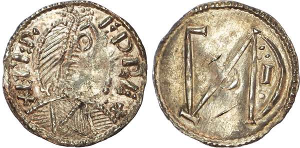 Danelaw (c.890), Five Boroughs, Penny, imitation of London Monogram type A, of Alfred the Great, unnamed moneyer, coarse style, type E, XL-F D' EDREX, F inverted, diademed bust right. Rev, monogram with inverted N and L, 1.30g. (MacKay Danelaw E, obverse similar to coin 5.1, die combination 5, O5/R5 – see plate 6, no. 95; S.964; cf. N.463). Extremely fine, weak on face but about as struck, of the highest rarity.