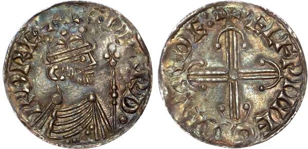 Edward the Confessor, AR Penny, Hammer Cross type (1059-1062), London, Aelfwine, Crowned and draped king right with sceptre, legend commences at top, +EADPAR RD REX, rev. Short voided cross with hammer head ends, pellet in centre, + ELFPINE ON LVNDE, 1.33gm. (Freeman 128; N 828; S 1182). Very Fine, some weakness in rev. legend, otherwise prettily toned with bluish iridescence.