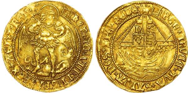 St Michael slaying dragon, inner beaded circles both sides, legend surrounds HENRIC VIII DI GRA REX AGL Z FR. Rev, ship sailing right, quartered flat topped shield of arms at centre, h and rose either side of cross above, ships rigging: two bowstrings to the left one to the right, legend reads PER CRVCE TVA SALVA NOS XPE REDE, 5.13gm (S. 2265; N. 1760; Schneider 561). Very Fine to Good Very Fine, rev. better, struck on a good full weight flan.