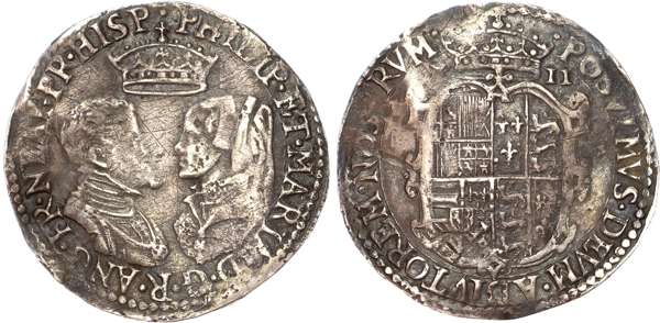 Wire line circles both sides, busts face‑to‑face, Philip on left, Mary to the right, crown above, legend surrounds PHILIP ET MARIA DG R ANG FR NEAP PR HISP. Rev, crowned oval quartered shield of arms incorporating Spain and England, legend reads POSVIMVS DEVM ADIVTOREM NOSTRVM, mark of value X‑II flanking crown, 5.55gm (S. 2498; N. 1967). About Very Fine, some scratches to obv., a couple of digs to rev., mild creasing.