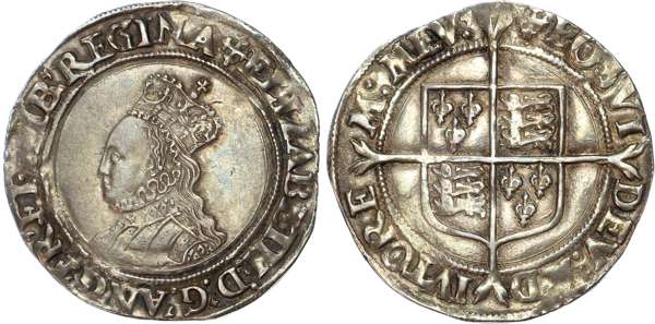 Crowned bust left [Bust 3C], beaded inner and wire line circles, legend surrounds ELIZABETH DG ANG FRA ET HIB REGINA. Rev, long cross fourchée over quartered shield of arms, reads POSVI DEV AD IVTORE M MEV, 6.26gm (S. 2555; N. 1985). Some weakness to bust, otherwise Good Very Fine, fields especially pleasing, hints of tone.