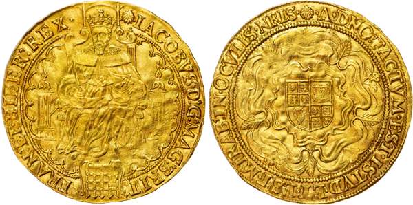 James I (1603-25) second coinage, Rose Ryal, mm. escallop (1606-7), crowned figure of king enthroned facing, flanked by two pillars, holding sceptre and orb, portcullis at feet, rev. shield of arms at centre of full-blown rose, wt. 13.71gms. (S.2613; N.2079; Schneider:-). Good very fine, portrait particularly pleasing. Very slightly creased, otherwise fully round with some lustre to surfaces.