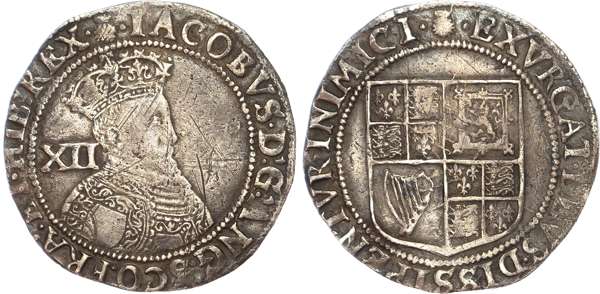 Second crowned bust right, value behind, legend surrounds IACOBVS DG ANG SCO FRA ET HIB REX. Rev, square topped quartered shield of arms, reads EXVRGAT DEVS DISSIPENTVR INIMICI, 5.72gm (S. 2646; N. 2073). Near Very Fine, some obv. scratches.