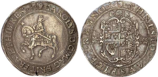 Charles I (1625-49), Crown, Tower mint, group II, type 2a, mm. harp (1632-1633), crowned figure of king on horseback l., shouldering sword, rev. oval, garnished shield of arms over long cross fourchée, CR above, wt. 30.17g. (S.2755; N.2193). Bold very fine, some parts better. Light even tone. Very minor flan crack at 6 o’clock and a couple of small scratches in the reverse field.