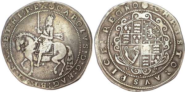 King on horseback left, holding upright sword, flowing sash terminating in two ends, inner beaded circles both sides, legend reads CAROLVS DG MAG BRIT FRA ET HI REX. Rev, oval garnished shield, legend reads CHRISTO AVSPICE REGNO, 29.11gm (S. 3045; N. 2531). Good Fine.