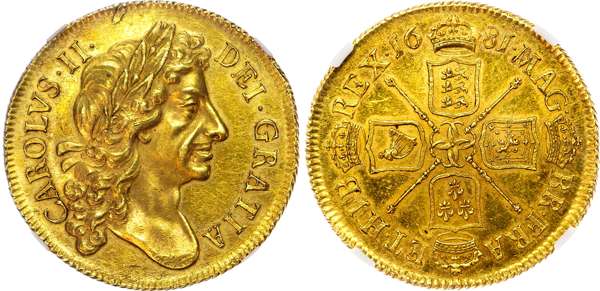 Charles II (1660-85), Two Guineas, 1681, second laureate head right, legend and toothed border surrounding, CAROLVS. II. DEI. GRATIA. Rev, crowned cruciform shields, sceptres in angles, four interlinked Cs at centre, date flanking top crown, legend follows MAG. BR. FRA. ET. HIB REX., no stop after HIB (Schneider 435; MCE 45; S.3335). Choice virtually mint state, with a pronounced golden lustre. Encapsulated and graded by N.G.C as MS63 and as such the finest known example of all the Charles II second head two guineas.