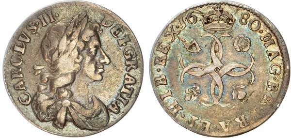 Draped and laureate bust right. Rev, crowned four interlinked Cs quartered emblems (S. 3384; Bull 632; ESC 1852). Very Fine or better, turquoise tone.
